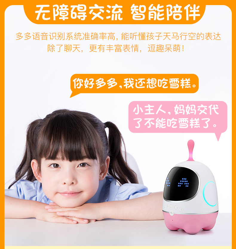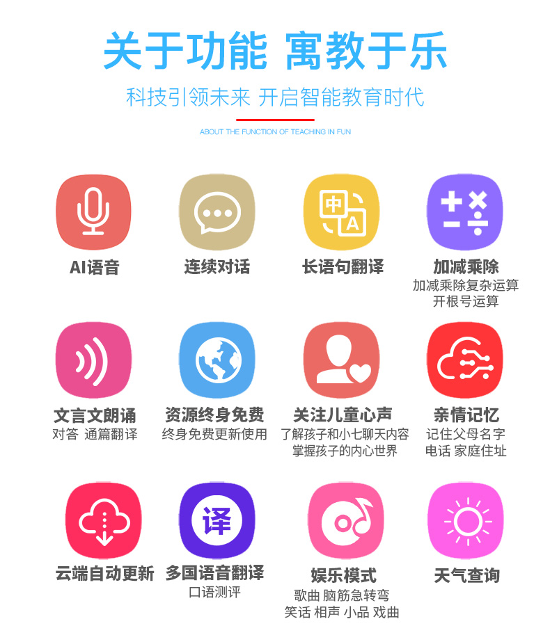 多多智能机器人功能简介:AI语音,连续对话,长语句翻译,加减乘除(加减乘除复杂运算,开根号运算),文言文朗诵(对答,通篇翻译),资源终身免费(终身免费更新使用),关注儿童心声(了解孩子和小七聊天内容,...