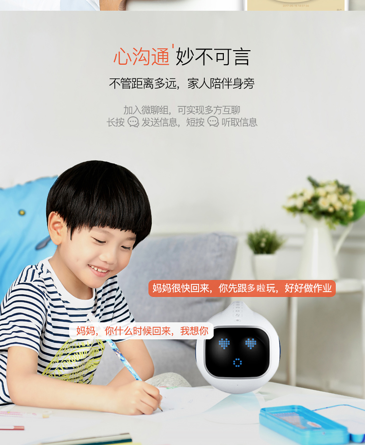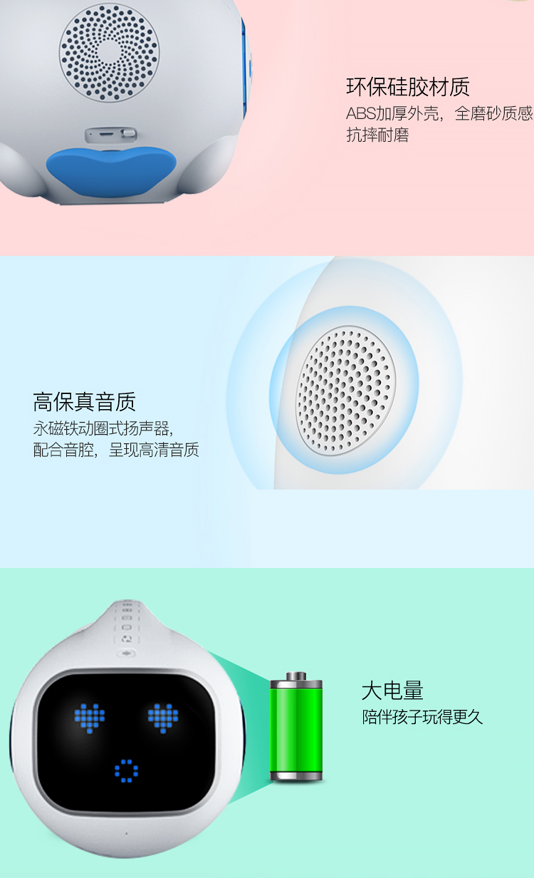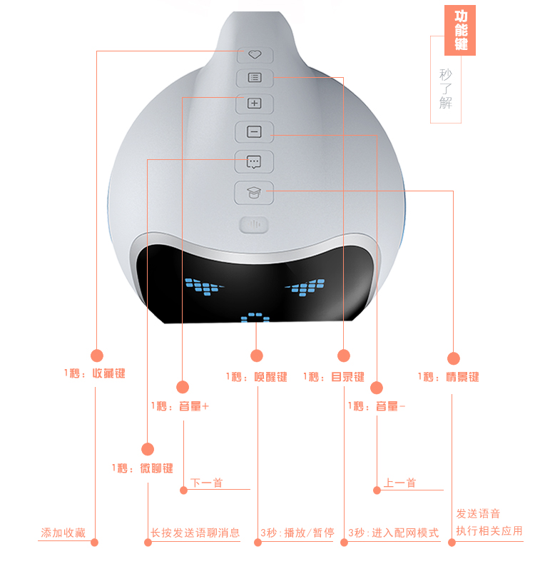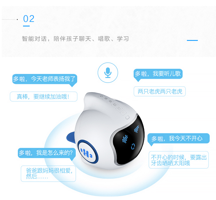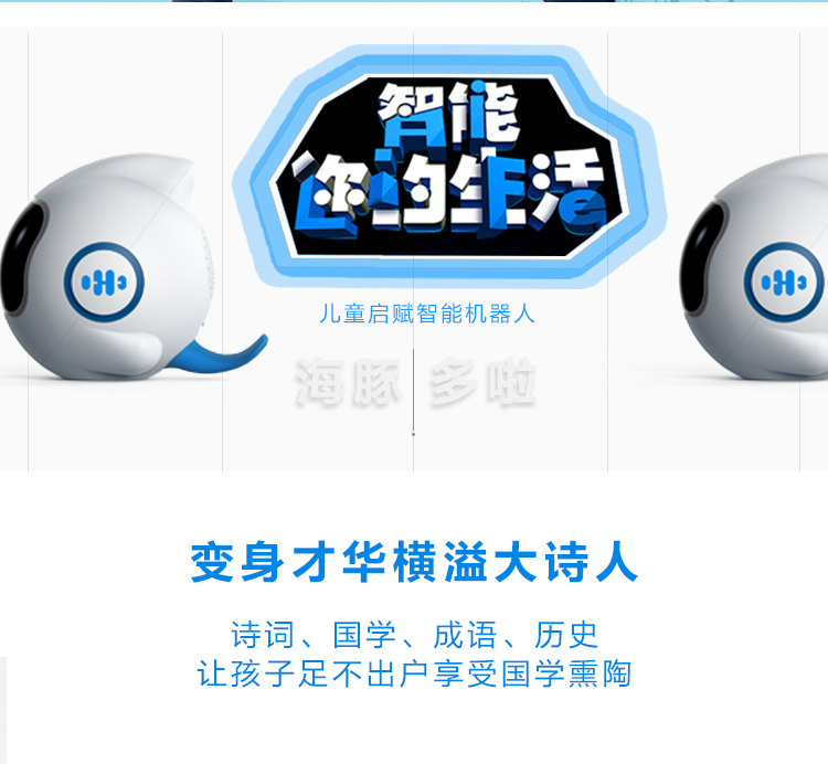 海豚哆拉智能机器人功能简介:智能语音,远程陪护,多轮对答,闹钟设定,互问互答,课堂同步,日历查询,性格养成,天气预报,百科知识,幼儿教育,国学诗词,语言快译,数学计算,儿歌音乐,成语接龙,离线播放,手...