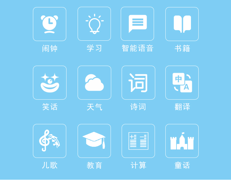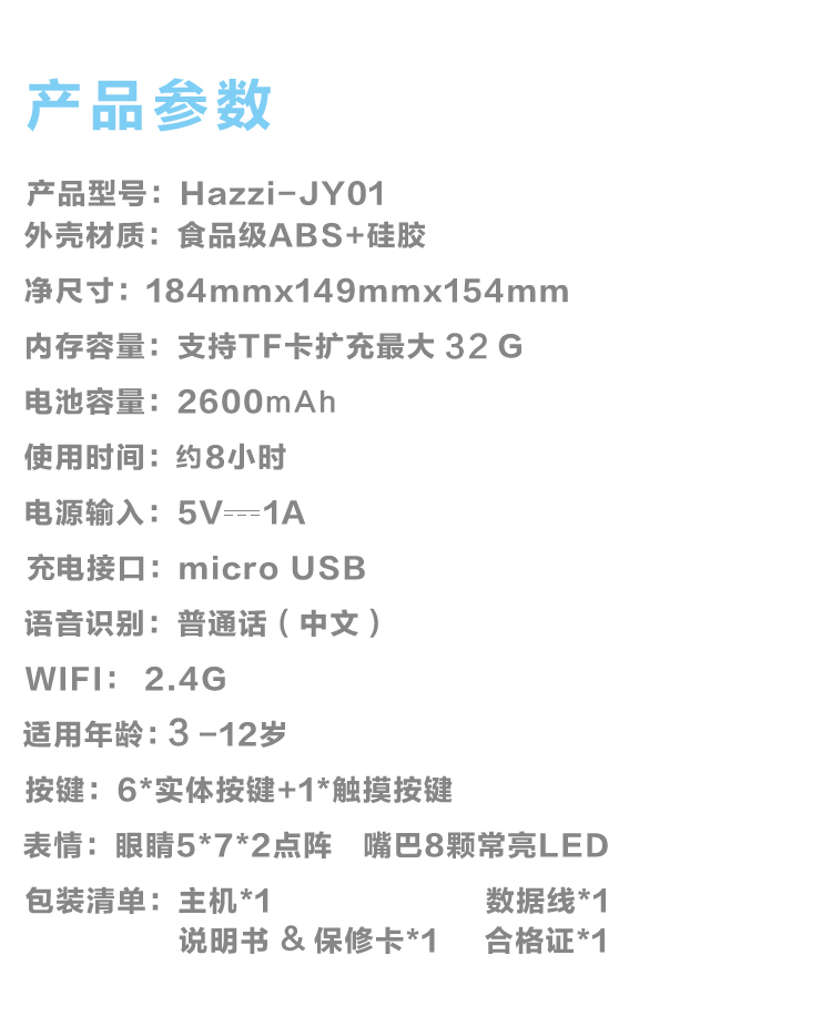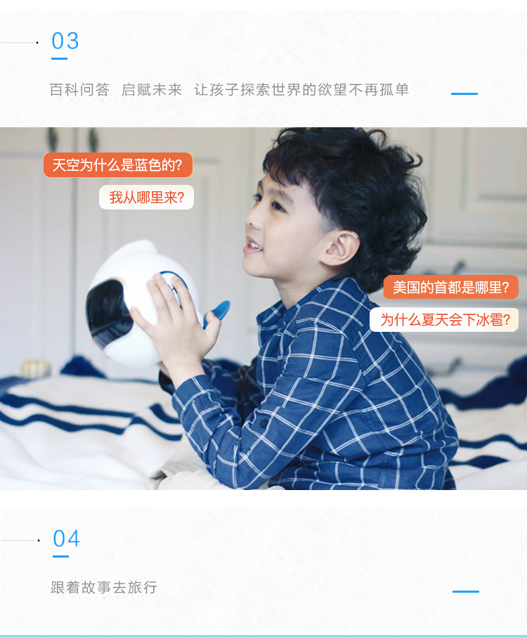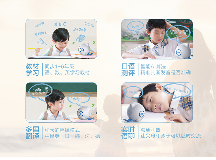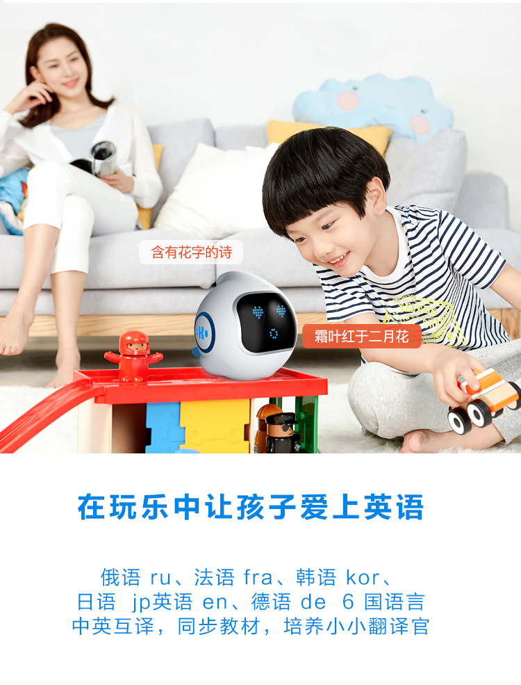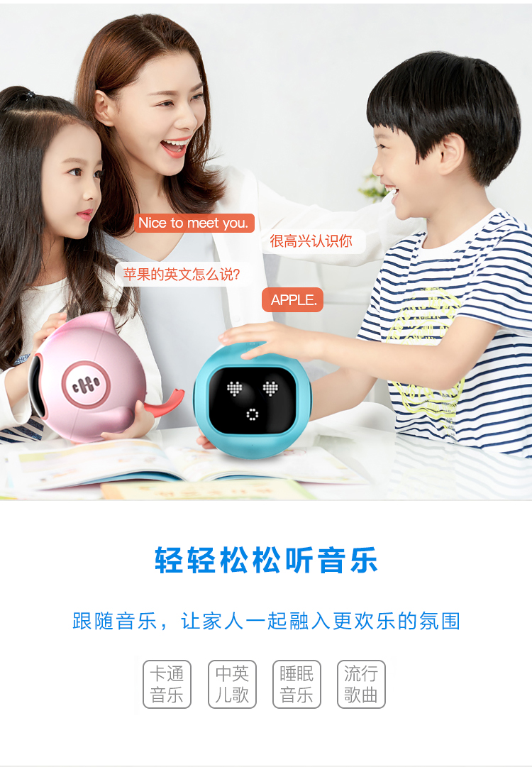海豚哆拉智能机器人功能简介:智能语音,远程陪护,多轮对答,闹钟设定,互问互答,课堂同步,日历查询,性格养成,天气预报,百科知识,幼儿教育,国学诗词,语言快译,数学计算,儿歌音乐,成语接龙,离线播放,手...