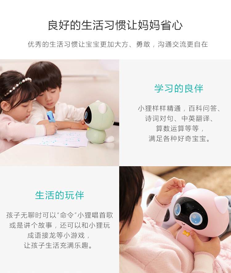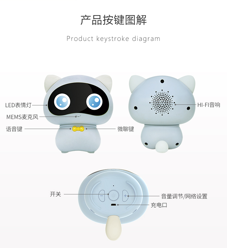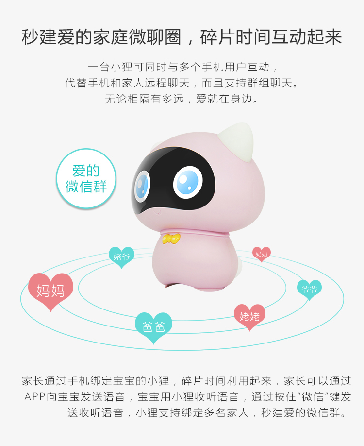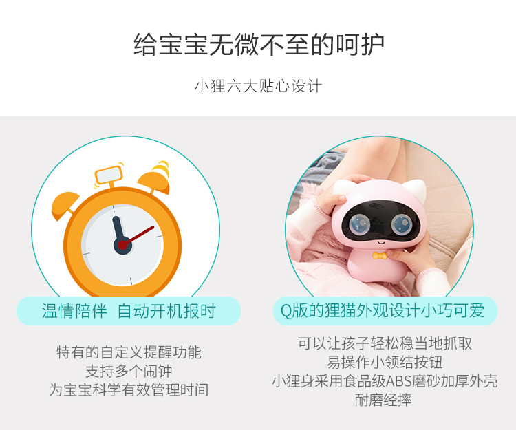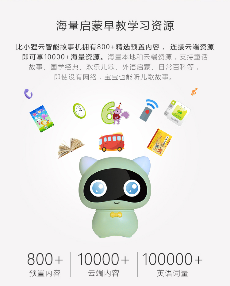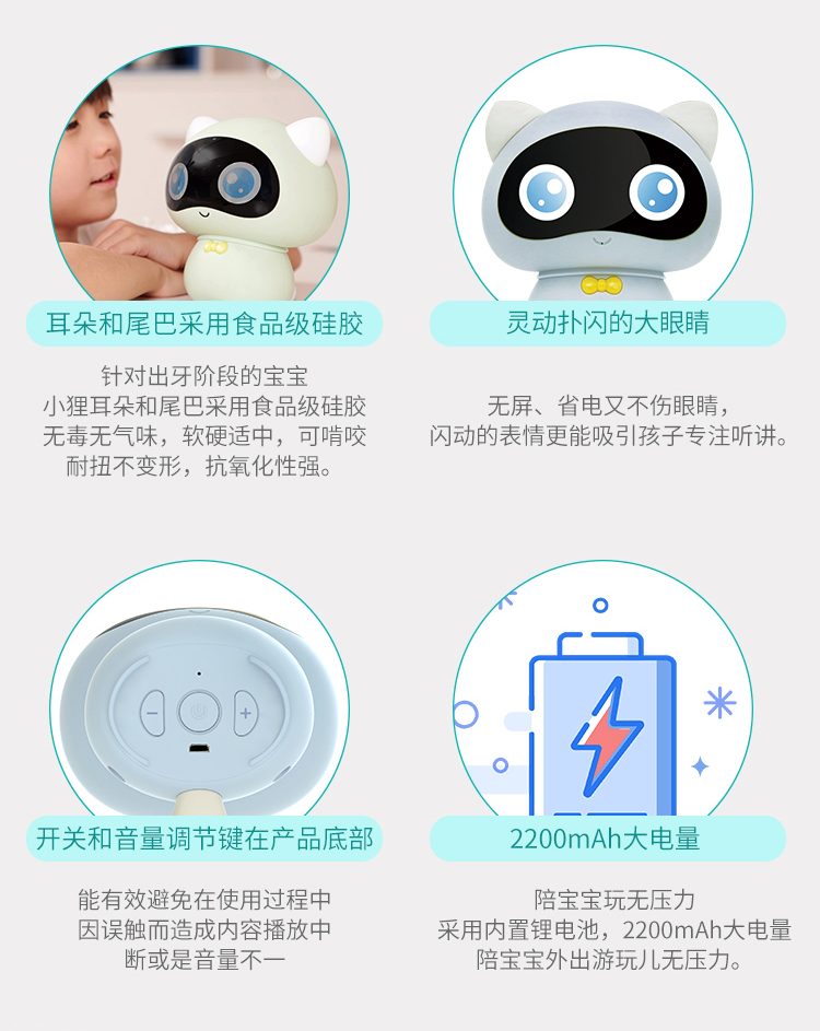 海量云端资源 童话外语儿歌国学课程等 手机APP远程智能控制 无缝接入微信聊天 食品级硅胶材质...